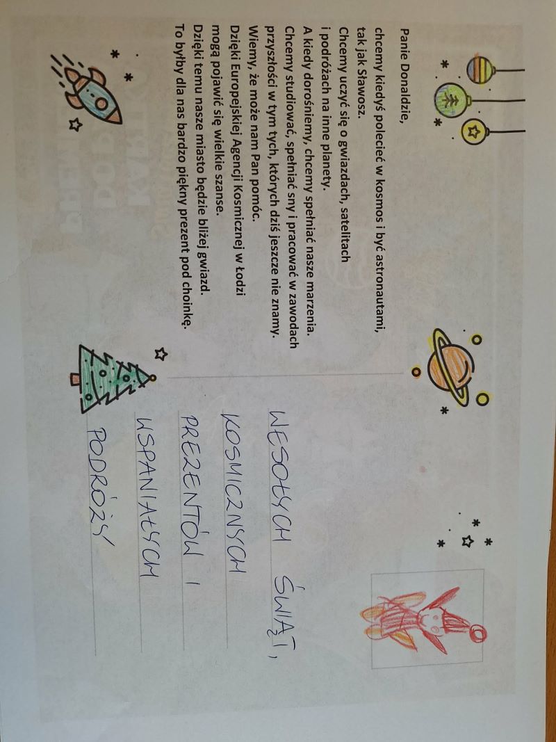 Nasze przedszkole dołączyło do ogólnołódzkiej akcji mającej na celu wspólne działanie na rzecz powstania siedziby Centrum Europejskiej Agencji Kosmicznej (ESA) w naszym mieście. Przedszkolaki ozdabiały i kolorowały dedykowane kartki z treścią listu.