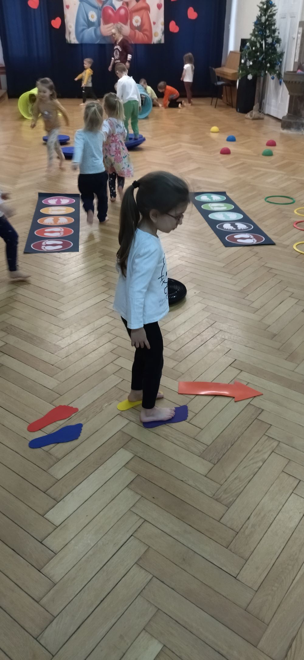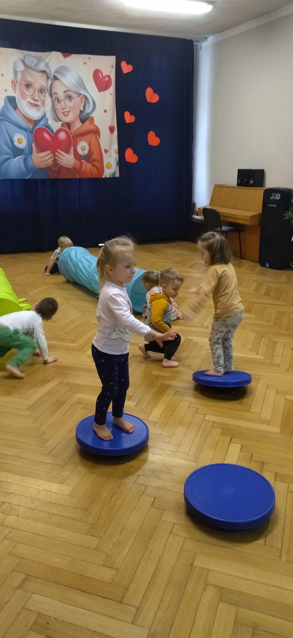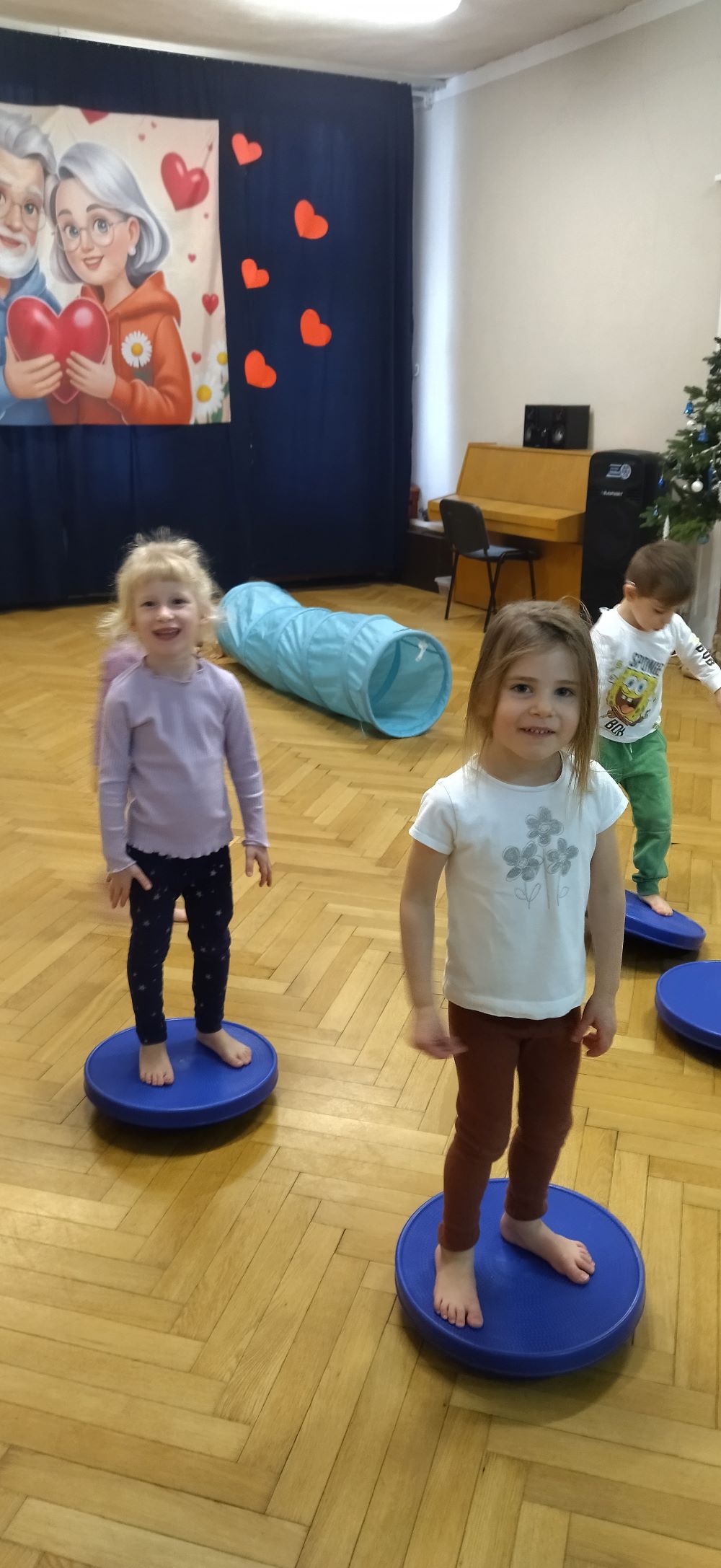 W styczniu w grupie II odbyły się kolejne zabawy sensoryczne w ramach projektu ,, Sensoryczne przygody’’. Tym razem były tory przeszkód, tunele animacyjne, maty i dyski sensoryczne. Zabawy boso stymulują receptory dotyku na stopach, rozwijają równowagę i świadomość własnego ciała. Poza tym dotykanie różnych faktur sprzyja rozwojowi zmysłów dziecka, niesamowicie pobudzając jego wyobraźnię. Zabawy przyniosły dzieciom wiele radości.
