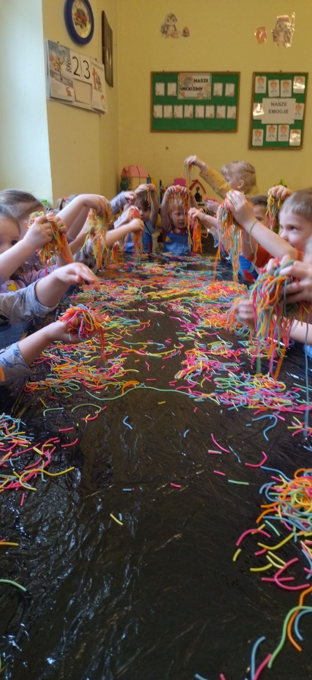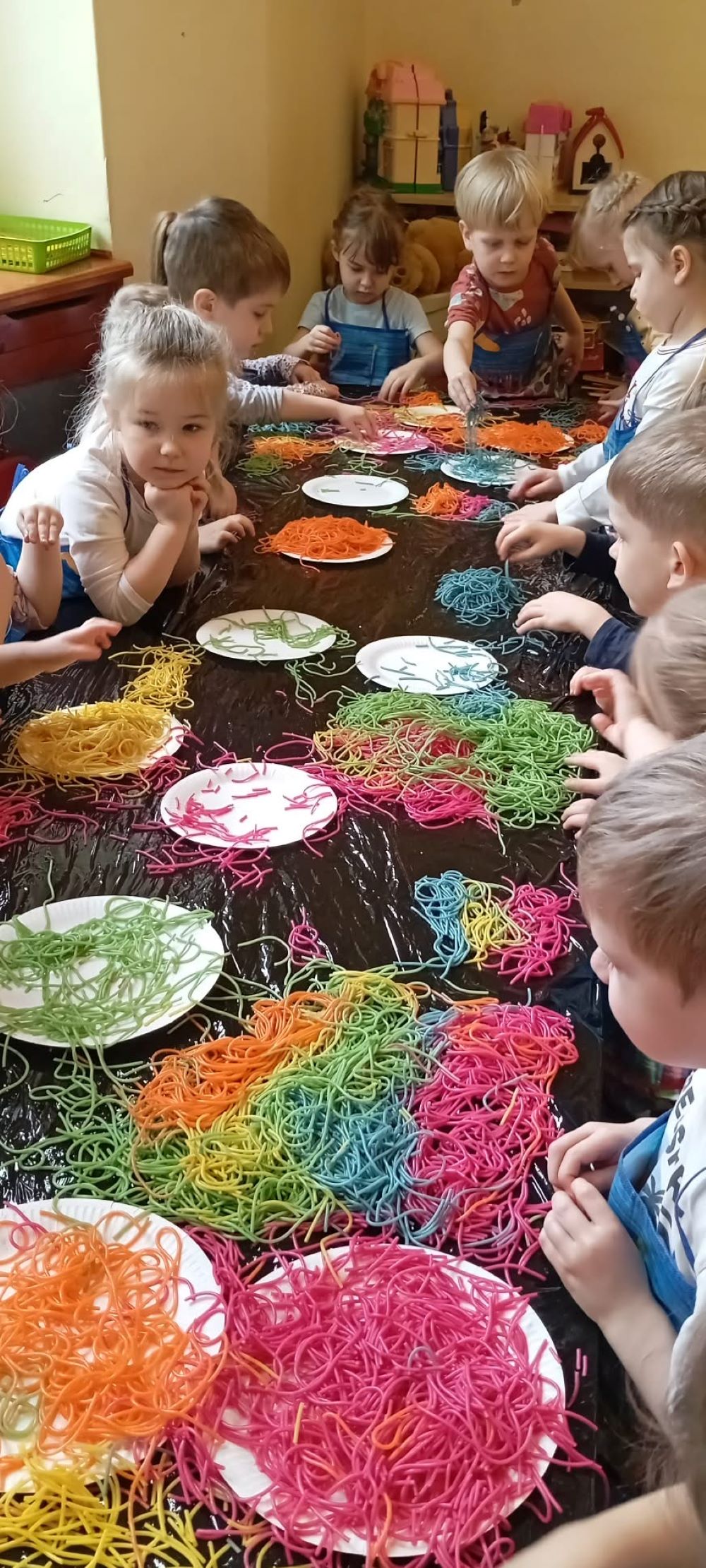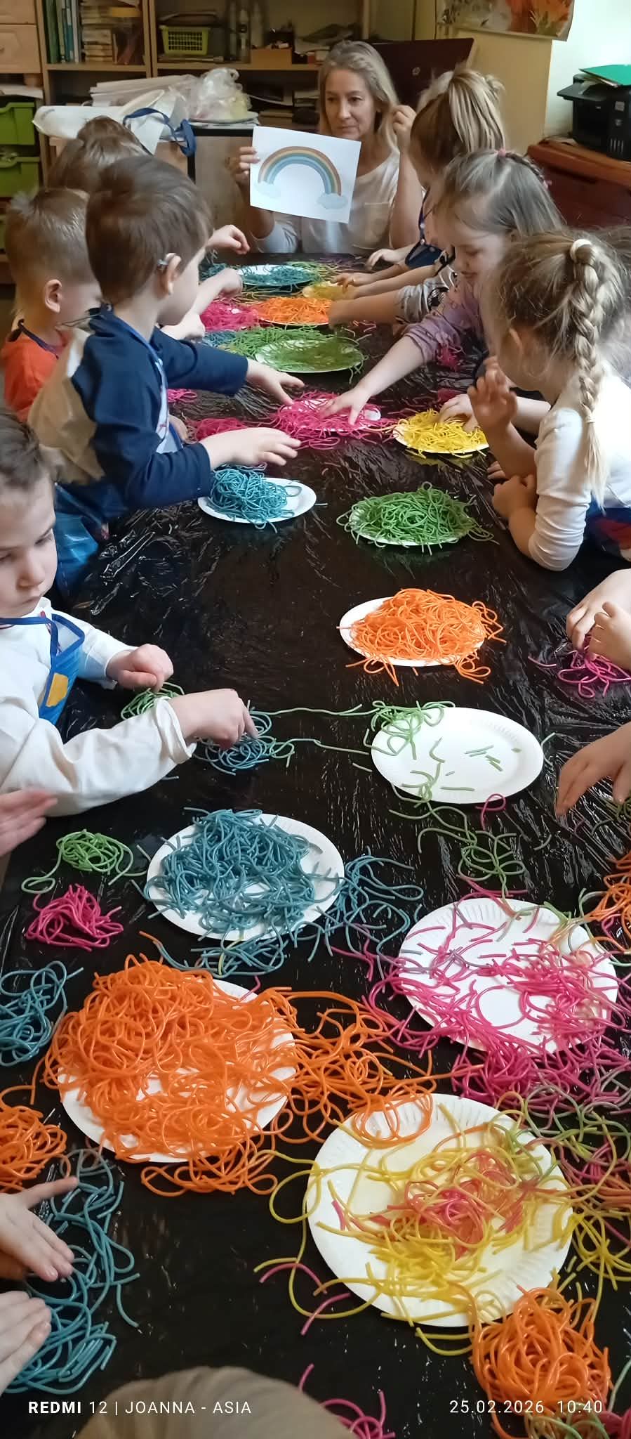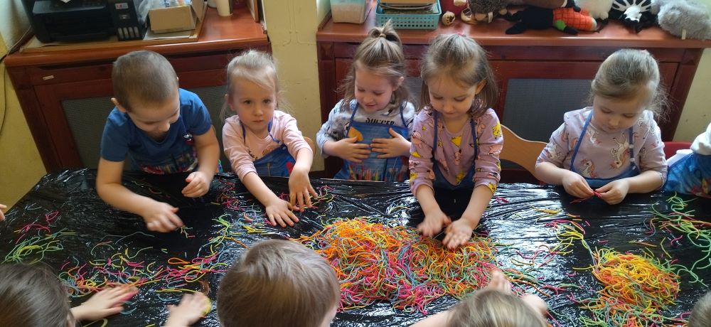 Projekt "Zabawy sensoryczne " nabrały kolorów tęczy. Tym razem przedmiotem zajęć było kolorowe spaghetti. Długie nitki makaronu w różnych kolorach znakomicie sprawdziły się podczas wspólnej zabawy. Jak zwykle podczas tego typu zajęć, przedszkolaki świetnie się bawiły.