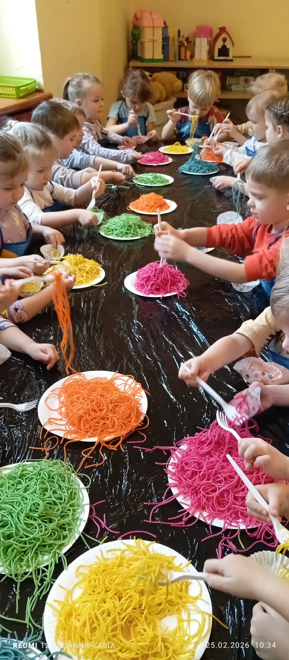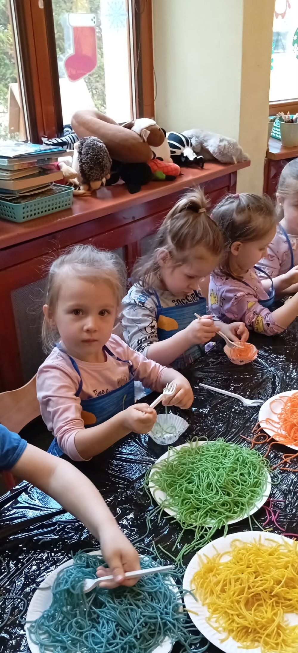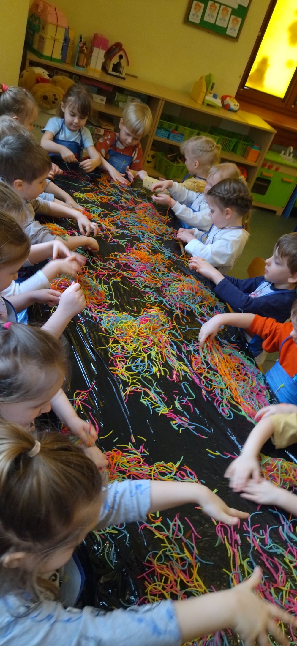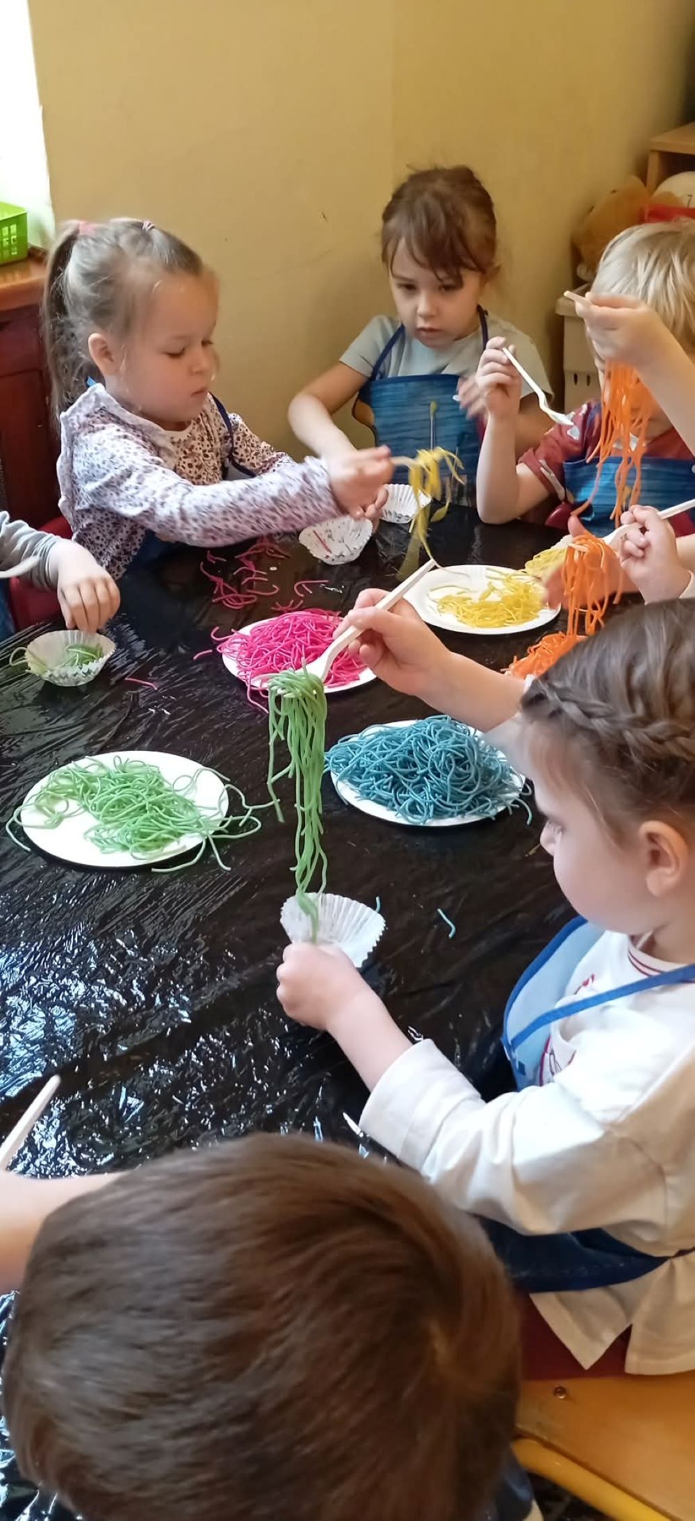 Projekt "Zabawy sensoryczne " nabrały kolorów tęczy. Tym razem przedmiotem zajęć było kolorowe spaghetti. Długie nitki makaronu w różnych kolorach znakomicie sprawdziły się podczas wspólnej zabawy. Jak zwykle podczas tego typu zajęć, przedszkolaki świetnie się bawiły.